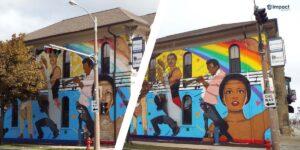 The iconic “Celebrate the Arts” mural, located on the west side of Impact Seven’s Milwaukee office, was first commissioned in 1984. Muralist Reynaldo Hernandez worked alongside the youth of the Milwaukee Commando Project to paint what became one of the most recognizable murals in the City. The mural is a depiction of various art forms, including a jazz musician, a drummer, and dancers.